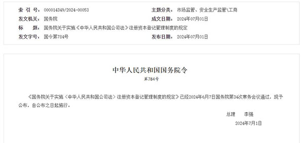 2024年7月1日,國務(wù)院總理李強簽署國務(wù)院令,公布《國務(wù)院關(guān)于實施〈中華人民共和國公司法〉注冊資本登記管理制度的規(guī)定》,自公布之日起施行。
