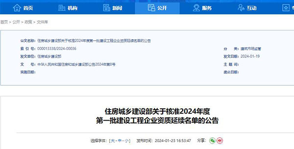 近日,住建部發(fā)布關(guān)于核準2024年度第一批建設(shè)工程企業(yè)資質(zhì)延續(xù)名單的公告。