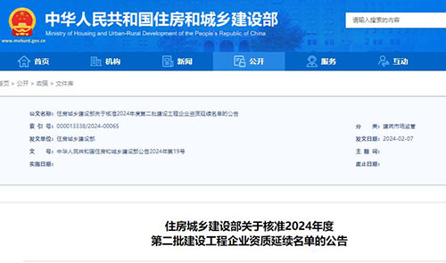 近日,住建部發(fā)布關于核準2024年度第二批建設工程企業(yè)資質延續(xù)名單的公告。