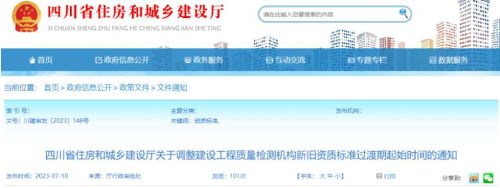 為做好建設(shè)工程質(zhì)量檢測機構(gòu)新舊資質(zhì)標(biāo)準(zhǔn)過渡工作,維護行政相對人合法權(quán)益,保障有關(guān)建設(shè)工程項目有序?qū)嵤?,四川省決定調(diào)整建設(shè)工程質(zhì)量檢測機構(gòu)新舊資質(zhì)標(biāo)準(zhǔn)過渡期起始時間。